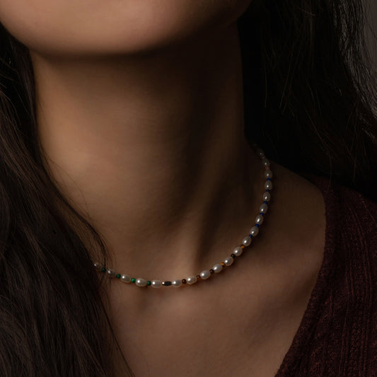 Nature Stone and Pearl Beaded Necklace(4.0-4.5mm freshwater white Pearl))